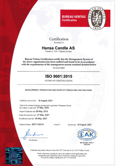 AS Hansa Candle perustettiin vuonna 1996. Tuotteitamme ovat kynttilät, ulkotulet ja sytytystuotteet. Alusta alkaen olemme keskittyneet laatuun, pitkäaikaisiin asiakassuhteisiin ja ympäristöystävälliseen tuotantoon. Näiden kolmen tavoitteen ansiosta olemme pystyneet kasvamaan niin, että olemme tänään Skandinavian ja Baltian suurin kynttiläntuottaja. Tällä hetkellä viemme tuotantoamme 15 maahan. Tehtaamme sijaitsee Virossa, Viljandin kaupungissa. Tehdasalueellamme on katettua tilaa yli 20000 m2 ja tänään meitä työskentelee jo yli 140 ihmistä. Tuotamme vuodessa muunmuassa yli 500 miljoonaa lämpökynttilää. Olemme panostaneet uusiin tuotantolinjoihin ja pystymme käyttämään sekä luonnosta saatavaa raaka-ainetta että perinteistä kynttilän raaka-ainetta – parafiinia.