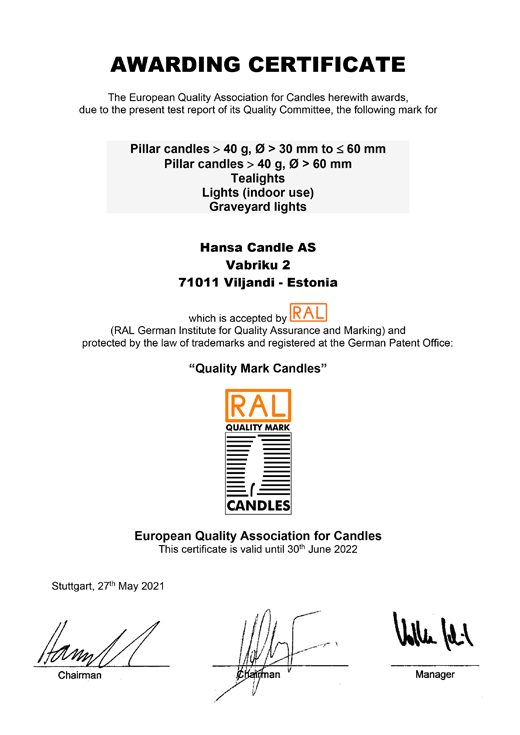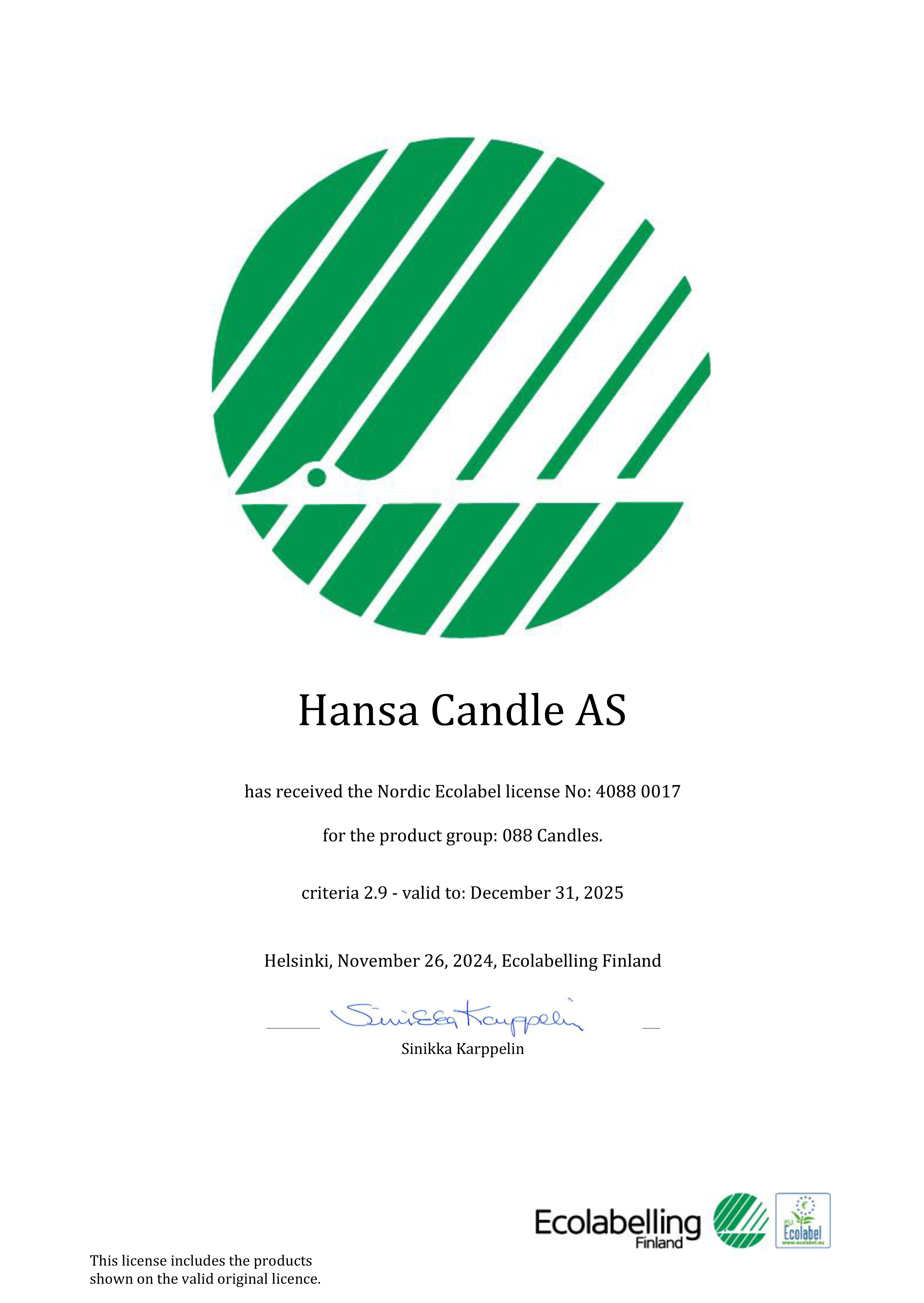 AS Hansa Candlen tuotteiden valmistuksessa on käytetty RSPO sertifioitua palmuvahaa.